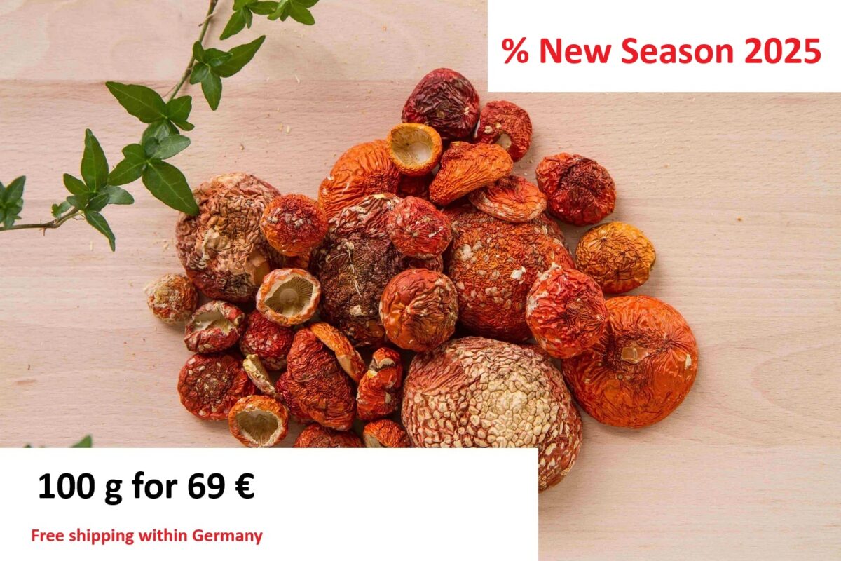 We offer dried, high-quality caps of the red fly agaric (Amanita muscaria). Mushrooms are collected and found in Germany and the more acidic regions of Europe. The drying process takes place in professional dryers at a temperature of 40-45 degrees Celsius. They are stored away from air and sunlight.